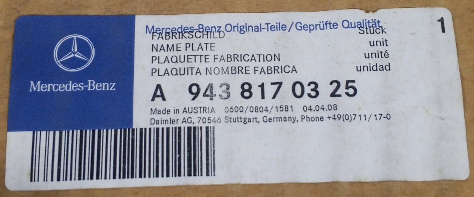 This original Mercedes-Benz factory name plate is used for vehicle identification and manufacturing information on Mercedes-Benz trucks.
