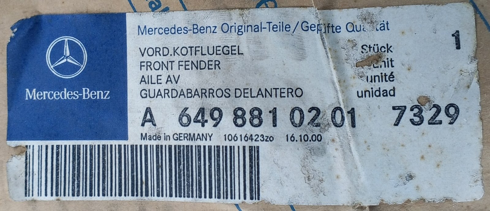 The Mercedes-Benz A 649 881 02 01 / A6498810201 is a genuine OEM front fender designed to protect the vehicle body from debris, mud, and road damage.