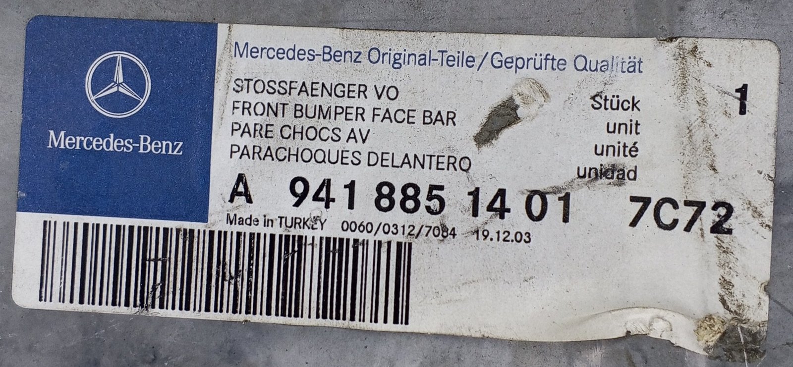 The Mercedes-Benz A 941 885 14 01 / A9418851401 is a genuine OEM front bumper face bar designed for Actros trucks.