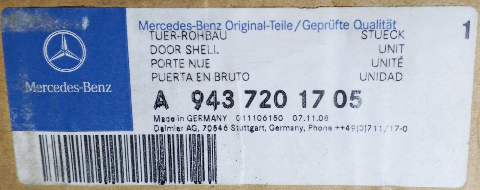 A 943 720 17 05 Mercedes Door Shell Genuine OEM