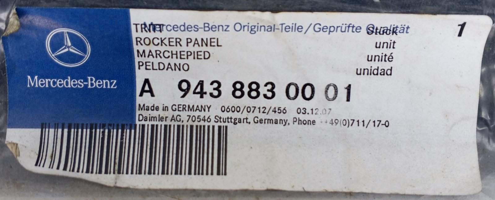 The Mercedes-Benz A 943 883 00 01 / A9438830001 is a genuine OEM rocker panel designed to provide structural support and protection along the lower side of the vehicle.