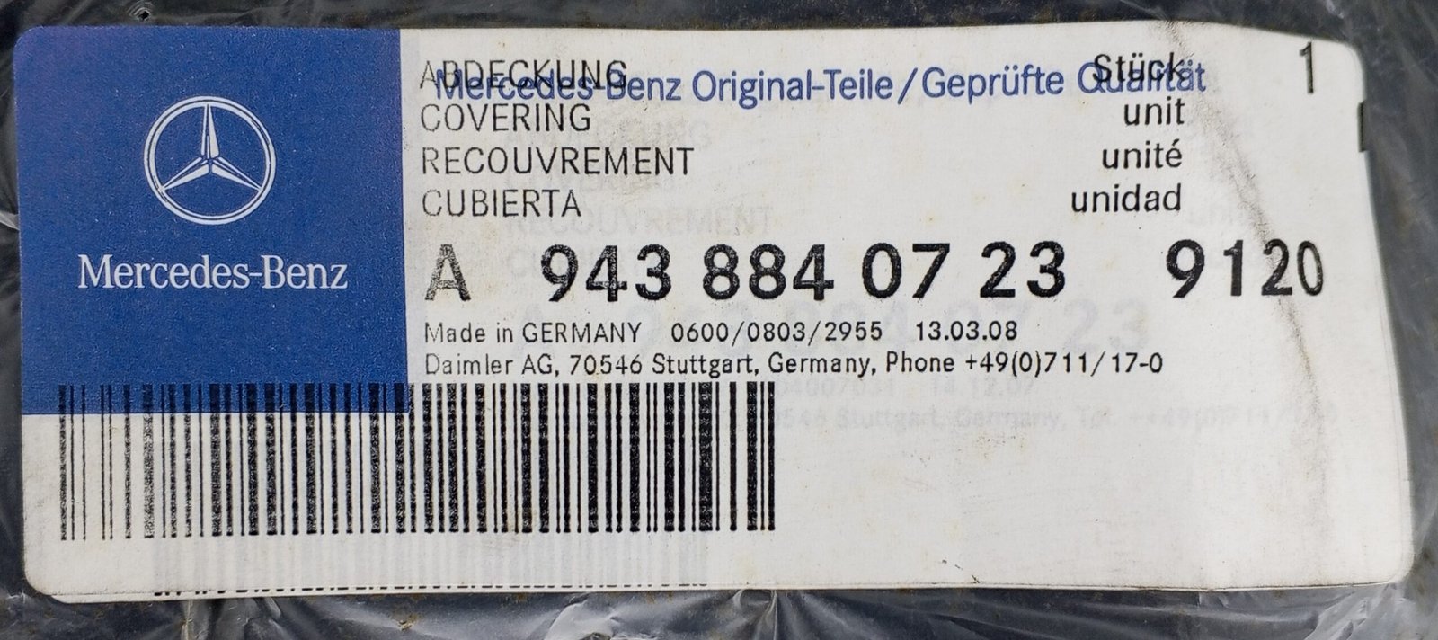 The Mercedes-Benz A 943 884 07 23 / A9438840723 is a genuine OEM fender cover designed to protect the wheel arch and surrounding body components from dirt, debris, and road impact.