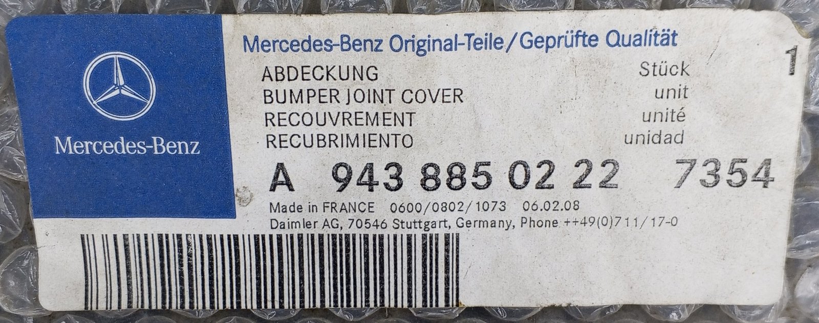 The Mercedes-Benz A 943 885 02 22 / A9438850222 is a genuine OEM bumper joint cover designed for truck front bumper assemblies.