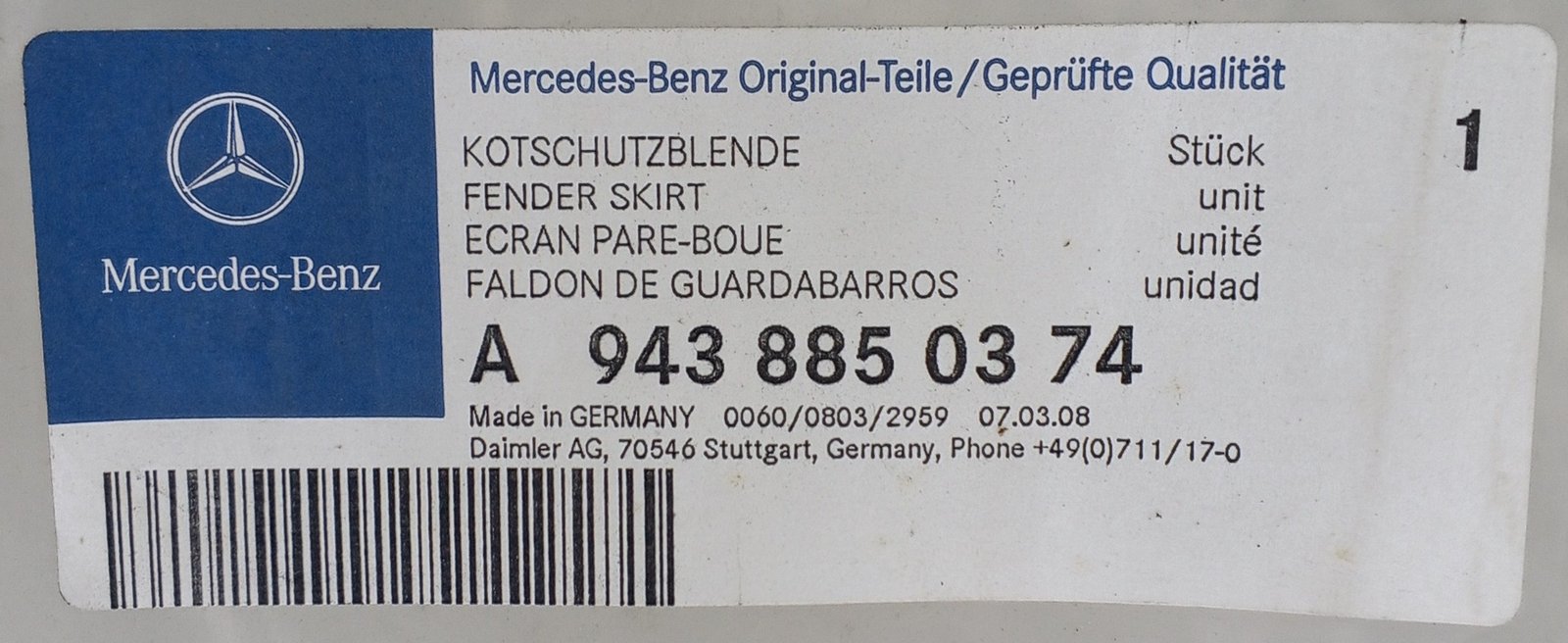 Genuine Mercedes fender skirt A 943 885 03 74 / A9438850374 designed for durability and perfect fit.