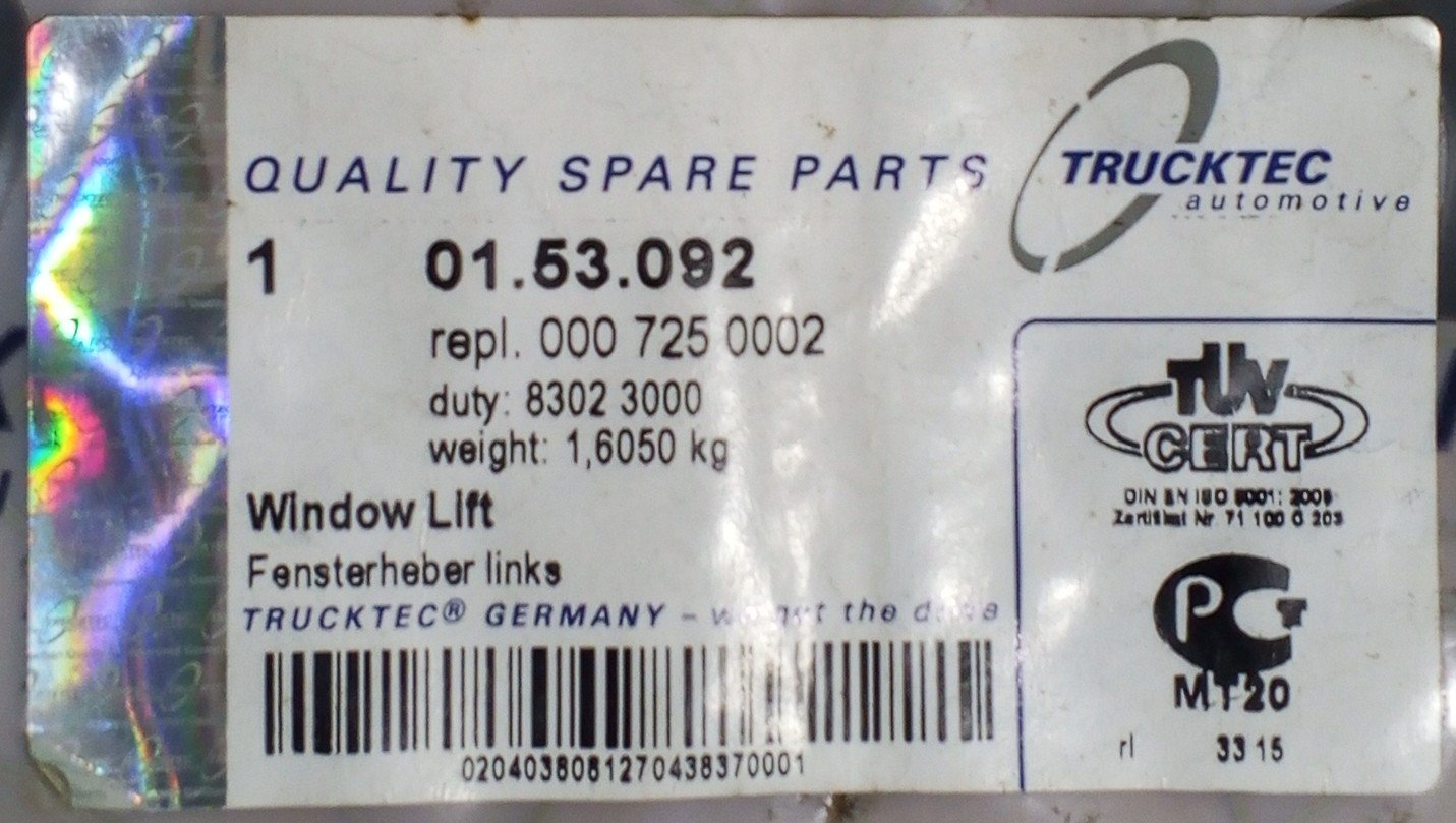 A 000 725 00 02 Trucktec 01.53.092 Window Regulator Left Mercedes